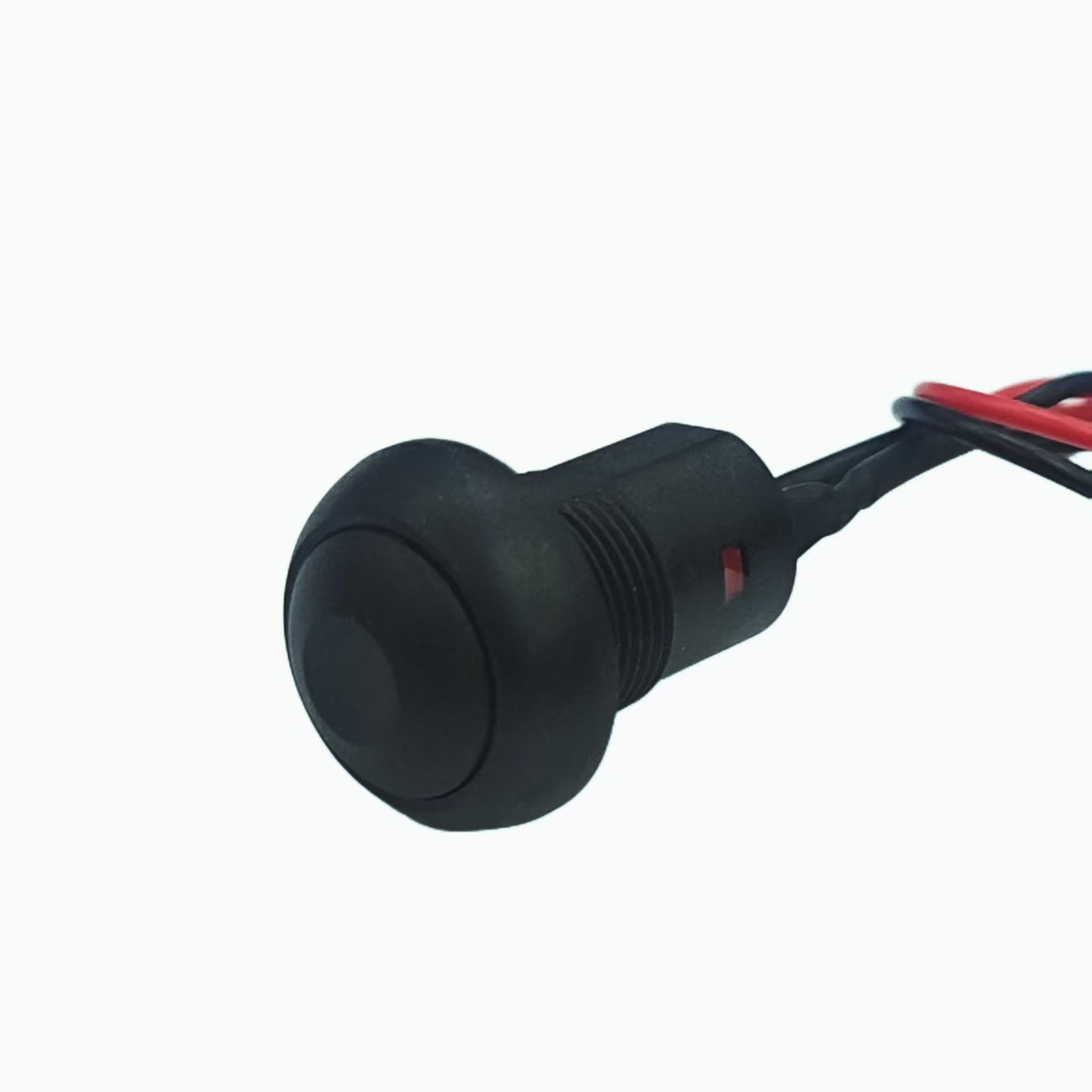 12mm self-locking power button switch with waterproof plastic housing. Ideal for industrial and electronic control applications, designed for long-lasting, reliable operation.